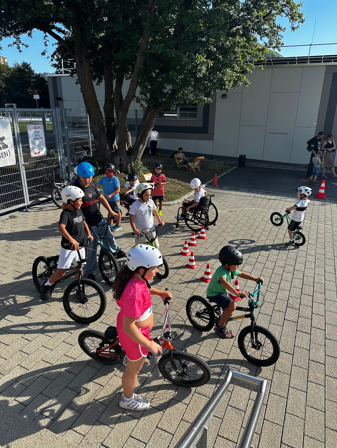 Bevor wir richtig in unsere Workshopreihe starteten, gab es am Morgen zuerst einmal einen "Trainer für Trainer"-Kurs. Hier zeigten die erfahreneren Skater und BMXer den unerfahreneren Betreuer*innen wie man die ersten Schritte der jeweiligen Sportart gut einem Anfänger erklärt, wie unterstützt werden kann und was die entscheidenden Tipps sind. Los geht es dabei immer mit der Suche nach dem stärkeren Fuß und dann kann man sich Schritt für Schritt die Basics auf dem BMX, Rollstuhl, Scooter und Skateboard erarbeiten. Wir freuen uns total, dass so viele junge neue Leute mit zum Helfer-Team des Skateparks gehören und sich bei den Workshops motiviert mit einbringen. Zuerst haben wir gemeinsam besprochen, auf was während der Workshops geachtet werden muss. Hier ist es ganz wichtig, dass jedes Kind einen passenden Helm trägt, wir auf die Funktionstüchtigkeit unserer Fahrzeuge achten und auf die individuellen Bedürfnisse der Teilnehmer*innen eingehen. Nach der Theorie ging es dann direkt an die Praxis und wir probierten selbst die ersten Schritte mit dem BMX und Skateboard aus und halfen uns gegenseitig.