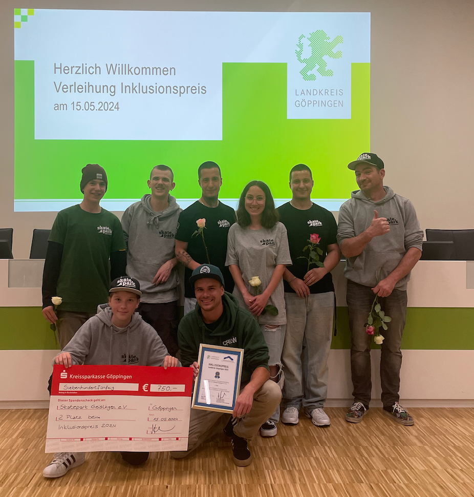 Wir freuen uns sehr über die Würdigung unserer Arbeit mit dem 2. Platz beim Inklusionspreis des Landkreis Göppingen! Der Preis wurde gemeinsam von der Hohenstaufenstiftung und dem Landkreis Göppingen ausgeschrieben und unser Skatepark Geislingen e.V. wurde zusammen mit der "Disco Inklusiv" des Vereins Fabrik für Kunst und Kultur und dem Kinderzeltlager "Camp der Fantasie" des AWO Kreisverbandes Göppingen als Sieger ausgewählt. Mit dem Preis soll Engagement für Inklusion im Landkreis anerkannt und gefördert werden und wir freuen uns schon darauf unser Preisgeld über 750€ für tolle weitere inklusive Projekte einsetzen zu können. Vergangene Woche durften wir bei einer Preisverleihung im Landratsamt unsere Urkunde entgegennehmen und unsere Arbeit im Skatepark vorstellen. Hiervon möchten wir euch ein paar Impressionen zeigen: