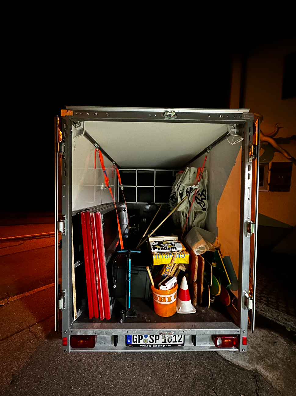 Im Juli 2024 hat es gestartet. Da hatten wir die Idee, einen Anhänger für den Skatepark zu kaufen, den wir ausbauen und mit mobilen Rampen, Fahrzeugen und Skate-Ausrüstung ausstatten können - um so einen mobilen Skatepark zu haben. Der Anhänger sollte unsere Leitgedanken, die wir vor Ort im Geislinger Skatepark schon seit langem leben, auch außerhalb des festen Parks ermöglichen. Jede*r soll dabei sein können, das Material wird kostenlos verliehen und unser Angebot findet ohne Anmeldung und Aufwand im Vorhinein ganz niederschwellig statt. Im September 2024 gingen wir dann den ersten großen Schritt und kauften uns bei ASG in Geislingen einen großzügigen Kofferanhänger. Nun musste geplant und getüftelt werden ... in den Anhänger sollte Einiges rein, trotzdem sollte er einfach aus- und einzuräumen sein und auch unterwegs wollten wir nicht auf coole Rampen verzichten. Das ganze Frühjahr und den ganzen Sommer 2025 wurde dann gebaut. Es entstand eine große, auseinanderbaubare Rampe aus Bühnenelementen, der Anhänger erhielt Befestigungsmöglichkeiten, Licht und ein Regal. Nach und nach kauften wir die Ausstattung für den Anhänger und im Herbst 2025 bekam dann alles den letzten Schliff. Zukünftig ist geplant, dass der Anhänger auch verliehen werden soll. Hierzu werdet ihr bald mehr erfahren.